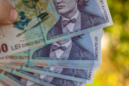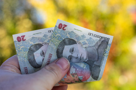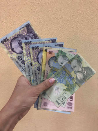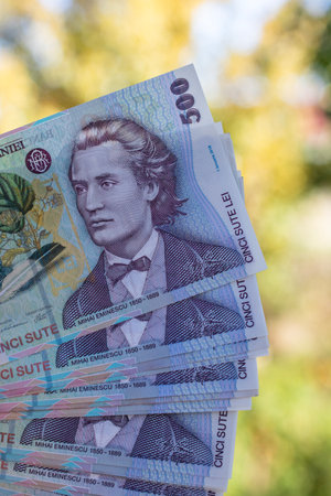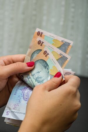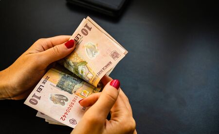 Selective focus on detail of LEI banknotes. Counting or giving Romanian LEI banknotes. World money concept, inflation and economy concept