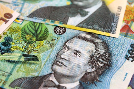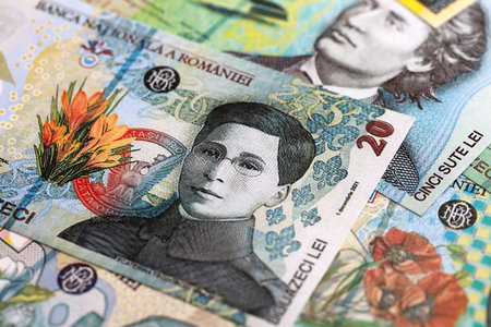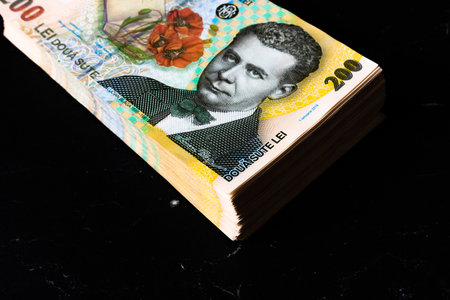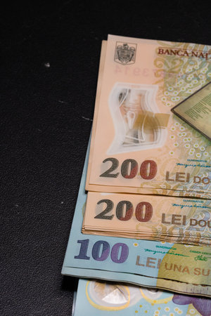 Selective focus on detail of LEI banknotes. Close up macro detail of Romanian LEI banknotes. World money concept, inflation and economy concept