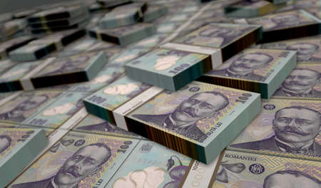 Romanian Lei money pack 3d illustration. RON banknote bundle stacks. Concept of finance, cash, economy crisis, business success, recession, bank, tax and debt in Romania.