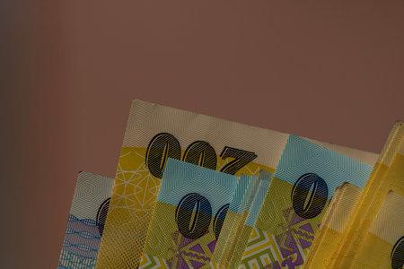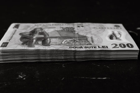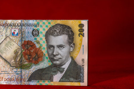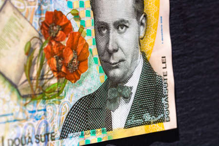 Selective focus on detail of lei banknotes. Close up macro detail of romanian lei banknotes, 200 lei isolated. World money concept, inflation and economy concept