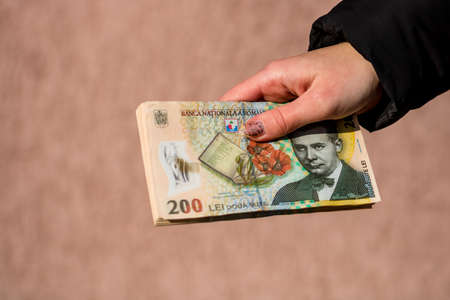 Woman hand giving money like bribe or tips isolated. LEI currency banknotes close up. Reward for hard work, finance and business concept