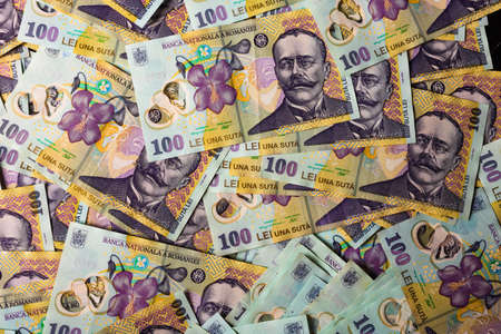 Selective focus on detail of lei banknotes. Close up macro detail of romanian lei banknotes, 100 lei isolated. World money concept, inflation and economy concept