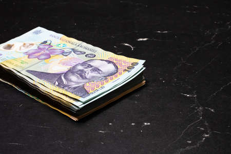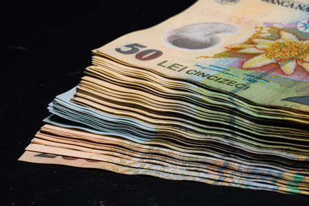 Romanian Leu currency money bills. RON currency banknotes in stack with different denomination close up