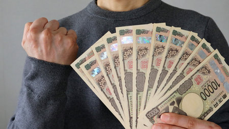 Woman hand holding Japanese Yen banknote stack. Thousand Yen money. Japan cash, Tax, Recession Economy, Inflation, Investment, finance and shopping payment concepts