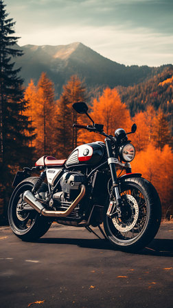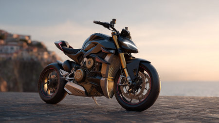 Sleek Modern Motorcycle Against Mountain Landscape Backdrop at Dusk