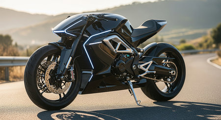 Futuristic Black Motorcycle on Scenic Road with Striking Lighting Accents