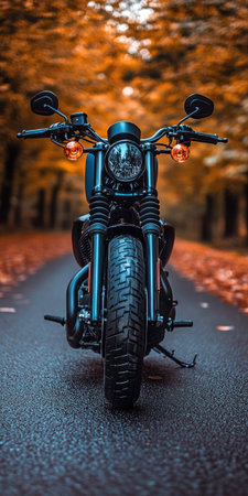 Motorcycle on the road in the autumn forest. The concept of extreme sports.