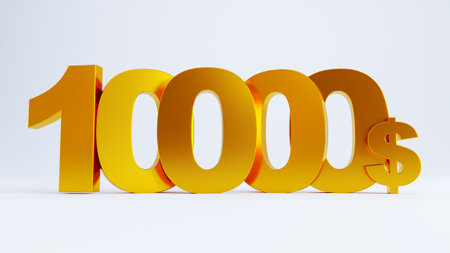 3d render of golden one thousand 1000 isolated on a white background.
