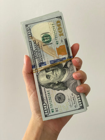 A woman hand holds a stack of 100 dollar bills