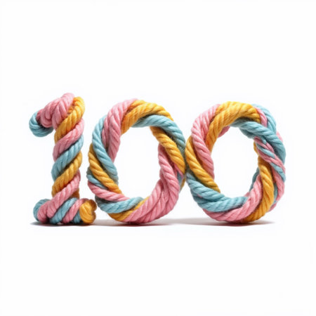 Illustration for birthday card, number 100 made of twisted rope in pastel colors on white background, symbolizing celebration and milestone.