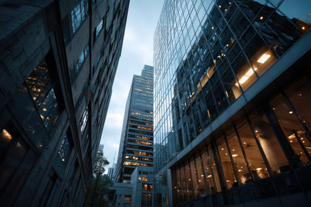 Close shot of modern buildings reflecting urban life in a bustling city during dusk with illuminated windows