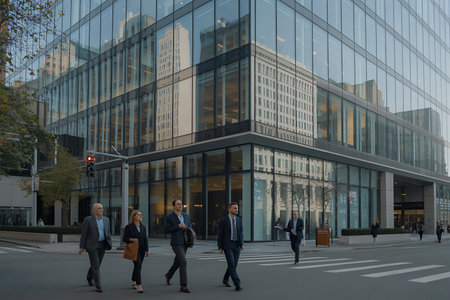 This image showcases a group of business professionals making their way across a pedestrian crossing near a modern office building The architecture features extensive glass facades reflecting the surrounding cityscape and creating a dynamic interplay of light and shadow The scene captures the hustle and bustle of urban life with individuals dressed in professional attire heading to or from work illustrating themes of corporate life teamwork and the energy of the city during the working day The modern architectural details the movement of the pedestrians and the overall urban setting make this image suitable for illustrating articles or marketing materials related to business finance and city life