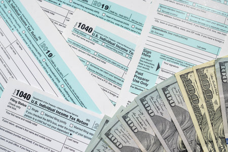 IRS form 1040 with individual income tax return of dollar bills, accountant is calculating company of Stimulus economic tax return check
