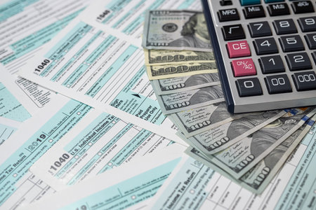 us dollar with calculator on tax form, tax time. financial document.
