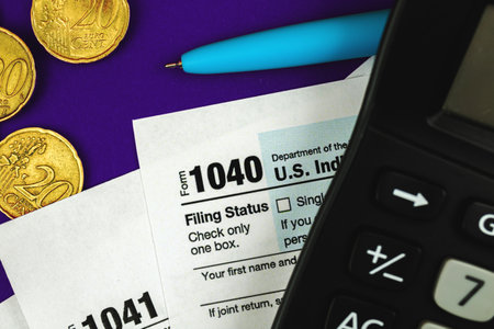 Individual Income Tax date time return form 1040 US with calculator on US american dollars