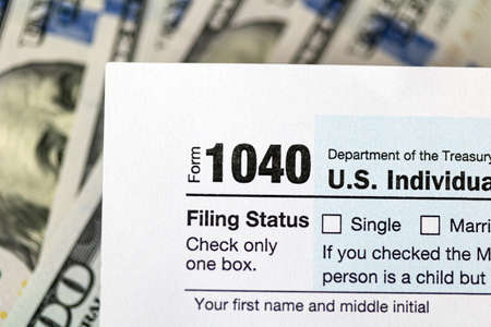 Closeup 1040 Tax form with refund check and currency US dollar banknotes