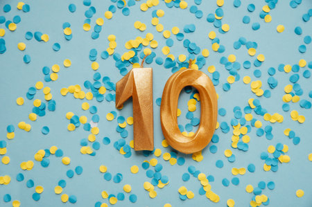 Number 10 ten golden celebration birthday candle on yellow and blue confetti Background. Ten years birthday. concept of celebrating birthday, anniversary, important date, holiday