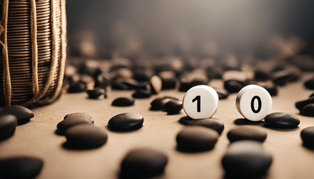 A close-up shot of the numbers one and zero, creating the number ten, laying on smooth gray stones with a brown blurry background.