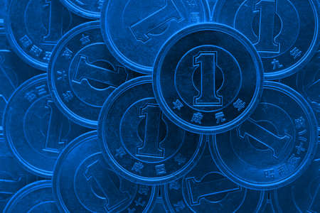 Surface of Japanese 1 one yen coins close up. Background on economic, financial or banking theme of Japan. Dark blue tinted backdrop or wallpaper. Rough money from circulation. Macro