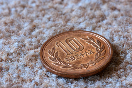Close-up of a Japanese 10 yen coin on a textured surface.