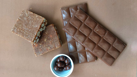 Chocolate bars, pé de moleque and raisins on a brown background
