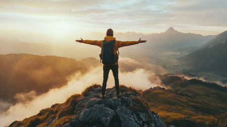 Victorious adventurer celebrates on top of a mountain and dancing, embracing the peaceful solitude and breathtaking views. Nature lover enjoys majestic wilderness and ambition. Camera B.