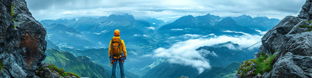 A lone hiker stands on a rocky summit, gazing at majestic mountains shrouded in mist and clouds.