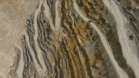 Aerial top view of open pit copper ore mine and heavy mining equipment. Excavator and mining trucks in quarry