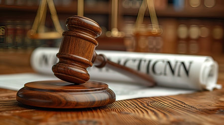Law theme, mallet of judge, wooden desk, legal documents