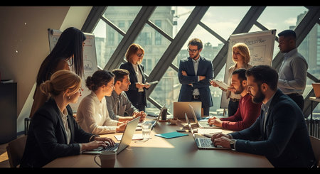 A modern office meeting with professionals collaborating around a table, laptops and documents present, bright natural light from large windows