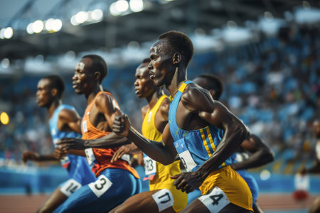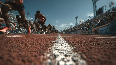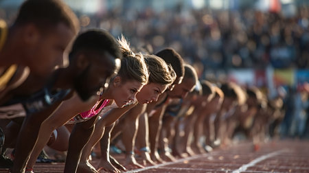 Runners poised at the starting line of a stadium, showcasing determination and focus as they prepare to launch into an exhilarating track race filled with anticipation and energy