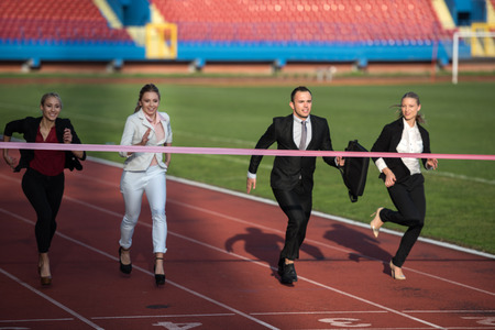 business people running together on racing track