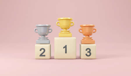 3D Rendering concept of winner. Set of trophy in gold silver bronze on winner podium 1st 2nd 3rd on pink background. 3D Render. 3D illustration. Minimal design template.