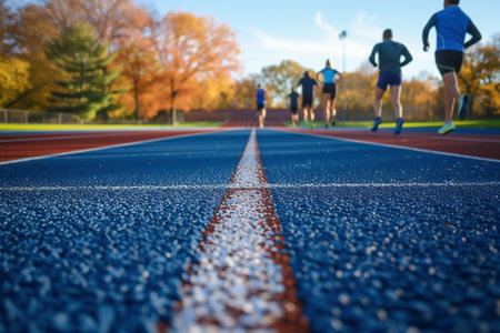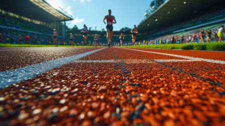 Energetic Athletes Race on Bright Red Track Under Sunlight, Showcasing Determination and Speed.