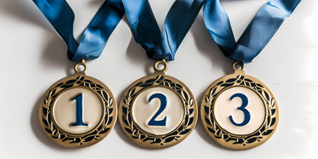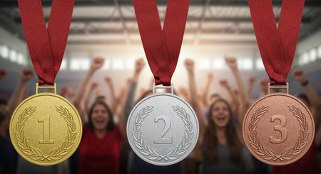 A close-up view highlights gold, silver, and bronze medals, each adorned with a laurel and a number, suspended above an excited, out-of-focus crowd with raised arms.