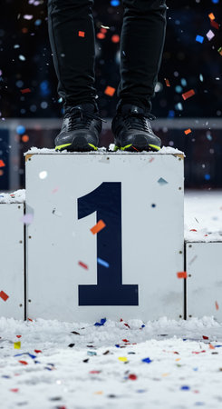 The top of a white podium, covered in snow and displaying a prominent number one, holds the feet of a triumphant athlete as vibrant confetti rains down in celebration.