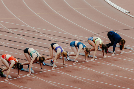 Chelyabinsk, Russia - June 2, 2018: start female sprinters in 100 meters running during UrFO Championship in athletics