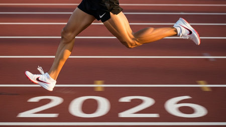 Close-up of the runner's feet as they start running on the stadium track, with a beautiful sunset in the background.