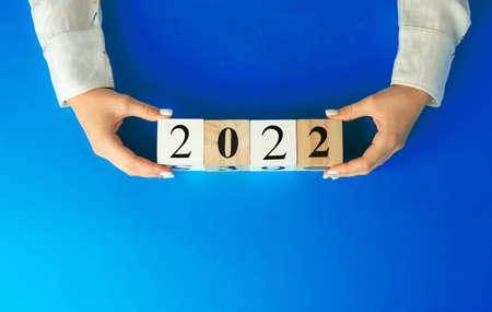 Hand of man put wooden block of 2022 new year on soft blue background