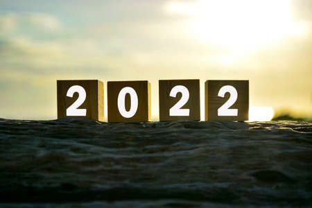 2022 number on wooden cube block on old tree stump with blurred background of green grass ocean and sunset