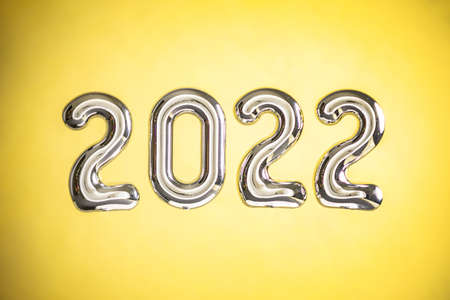Volumetric metallic silver numbers 2022 on a yellow background. Greeting on the New Year. Top view and copy space.