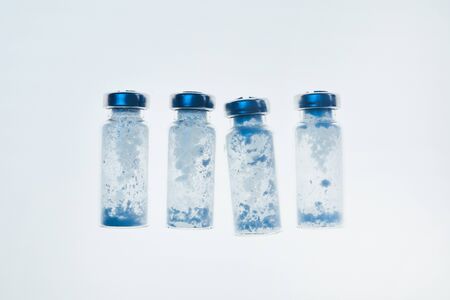 Vials of powder Covid - 19 vaccine on blue background