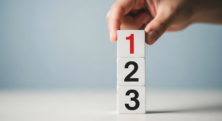A hand carefully stacks wooden blocks with numbers, isolated on a white background. The blocks symbolize education, learning, counting, and mathematical concepts.