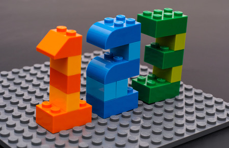 Tambov, Russian Federation - March 27, 2015 Lego custom numbers 1, 2, 3 on Lego gray baseplate. Black background. Studio shot.
