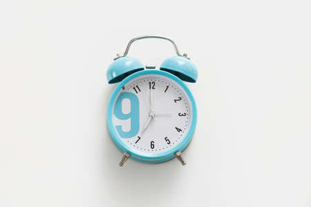 Alarm clock pointing at 9 o'clock with customizable space for ideas or text. Copy space and time concept