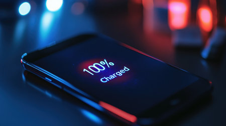 A close-up of a sleek smartphone glowing with a vibrant 100 Charged notification on its screen, symbolizing efficiency.