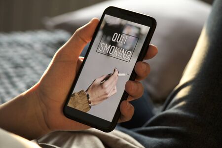 closeup of a young caucasian man, wearing casual clothes, lying on bed, having his smartphone in his hands with the text quit smoking in its screen