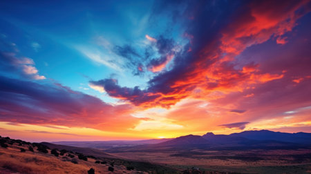 AI Generated. A dramatic shot of a sunset over a rocky desert landscape where the sky ignites in vibrant hues of red and orange