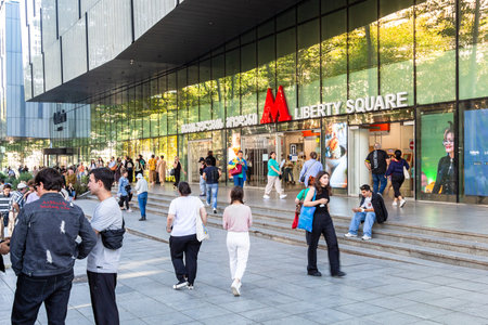 Tbilisi, Georgia - September 27,2023: entrance to Liberty Square metro in Galleria Tbilisi mall on Shota Rustaveli Avenue of Tbilisi city on sunny autumn day