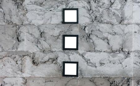 This image features three blank Polaroid photos arranged in a row on a tiled surface. The photos are white with black centers, indicating they are unused. The background consists of light and dark tiles, creating a checkered pattern.